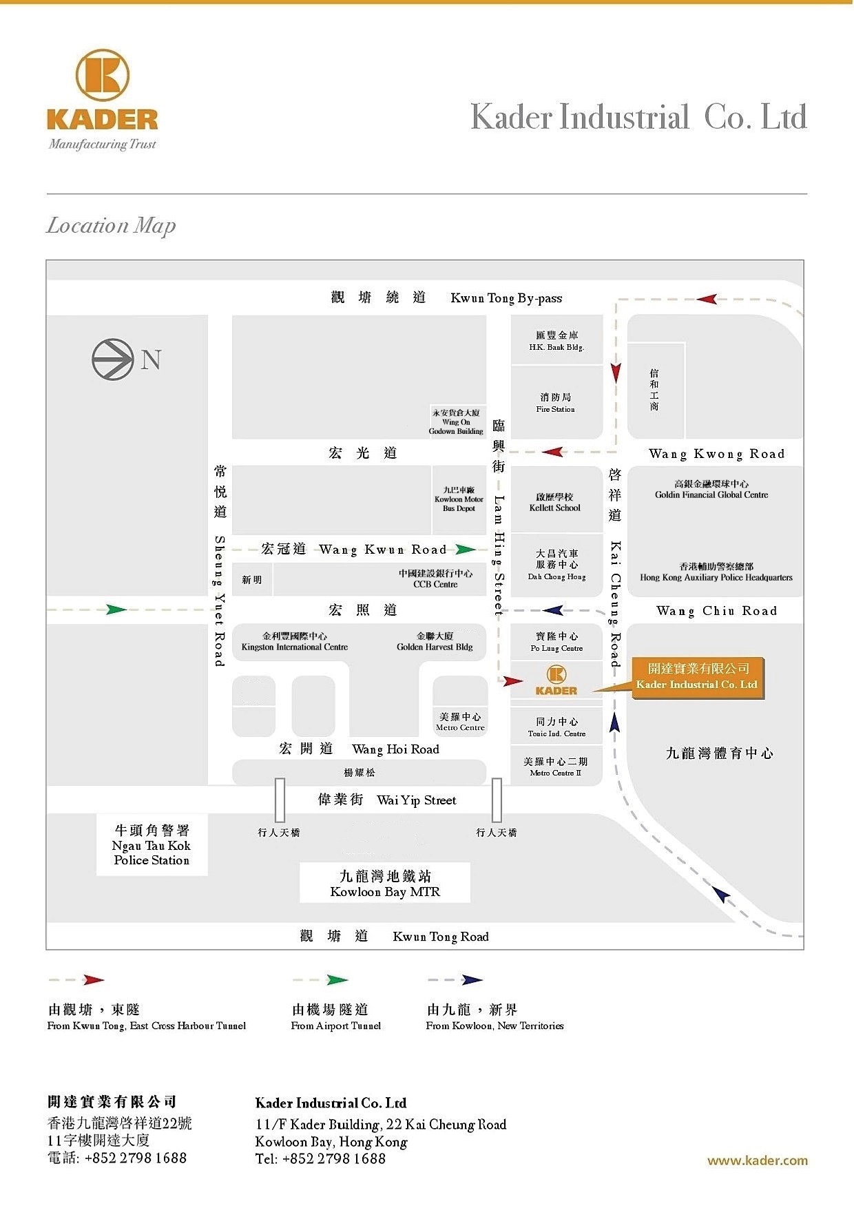 Kader Building is located in one of Hong Kong's prominent commercial and retail districts – Kowloon Bay, with easy access to retail and residential centers, as well as public transportation. It abuts Kai Cheung Road and Wang Chiu Road, which is the major bus route corridor in the area. The building is also within 500m walking distance to MTR Kowloon Bay Station.
